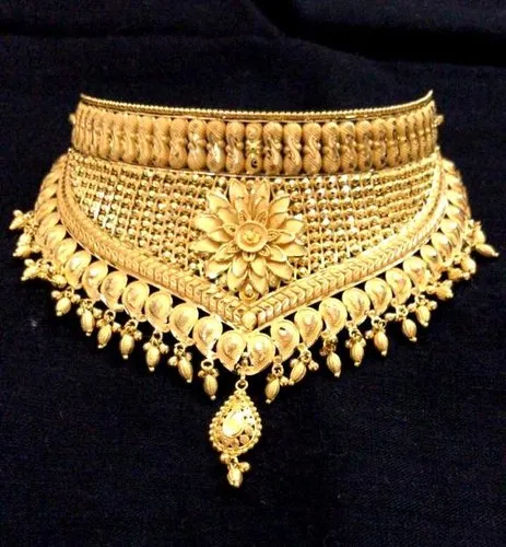 The Royal Heritage Gold Choker Necklace is a timeless masterpiece crafted with precision and passion. Its intricate lattice pattern, adorned with delicate motifs and a central floral design, exudes elegance and luxury. This piece perfectly combines traditional artistry with a regal aesthetic, making it a must-have for brides, festive wear, and grand occasions.